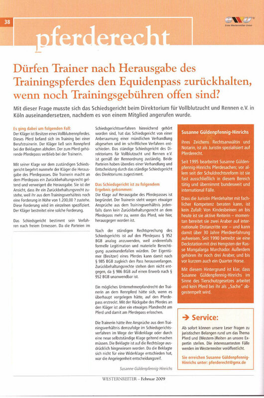 12.2013 Aufklärungspflicht eines Verkäufers 09.2013 Der Bedeckungsvertrag 08.2013 Haftungsrisiko Pferdepensionsvertrag 06.2013 Pferdetausch in Dubai mit Hindernissen 04.2013 Pferdeprozess wegen Mangelhaftigkeit