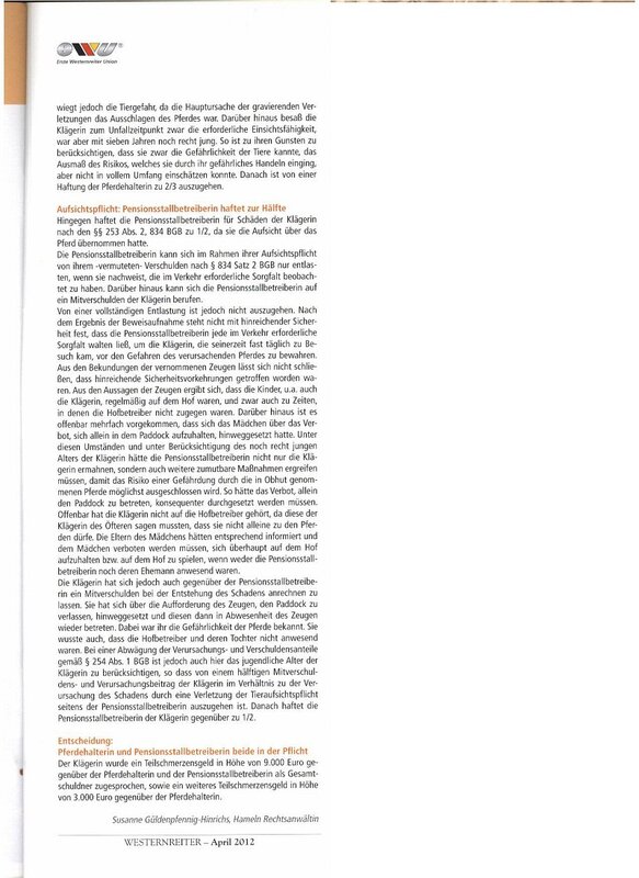 12.2009 Nachbesserung für Schulpferd grundsätzlich erforderlich 10.2009 Tierarzthaftung bei fehlerhafter Ankaufsuntersuchung 09.2009 Gemeinschaftliche Haftung mehrerer Pferdehalter 08.2009 Urteil zur Pferdefütterung 07.2009 Sommerzeit = Weidezeit 06.2009 Verletzt bei Hilfe am fremden Pferd 05.2009 Der Pferdeschutzvertrag 04.2009 Stute "ungewollt tragend" 03.2009 Der Schlittenhundefall 02.2009 offene Trainingsgebühren 01.2009 Tod auf dem Pferdeanhänger
