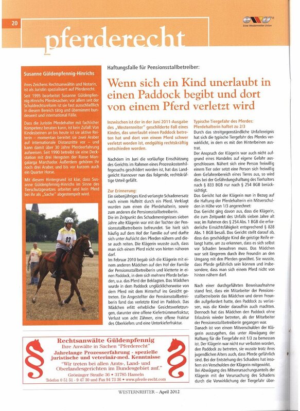 12.2012 Haftung für private Pferdeverkäufer 11.2012 Stacheldrahtumzäunung auf Pferdeweiden 07.2012 Tierarzthaftung 04.2012 Haftungsfalle für Pensionsstallbetreiber 02.2012 Besonderheiten bei der Pacht von Zuchtpferden 01.2012 Die Eigentumsurkunde