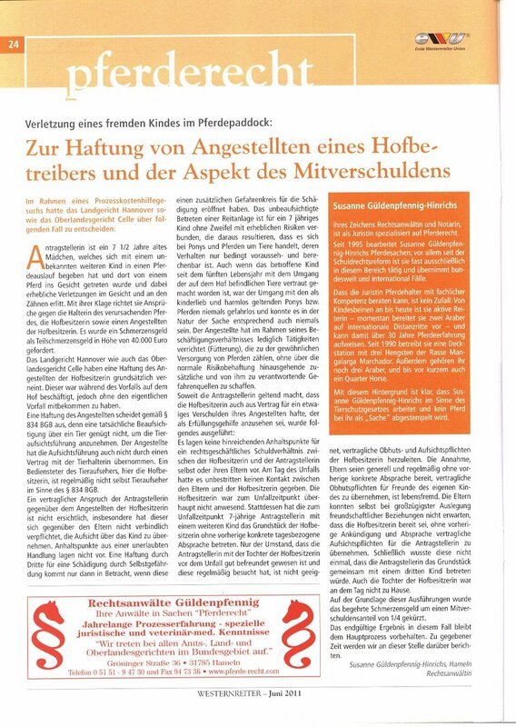 11.2011 Nacherfüllungsrecht für den Pferdeverkäufer 09.2011 Verkauf von Stuten - Fohlen geschuldet 07.2011 Haftung bei Weideunfällen 06.2011 Haftung von Angestellten eines Hofbetreibers 05.2011 Haftung beim Auktionskauf 03.2011Der Schmied in der Haftung 02.2011 Ein Fall aus dem Pferderecht 01.2011 Neues zum Pferde-Kaufrecht